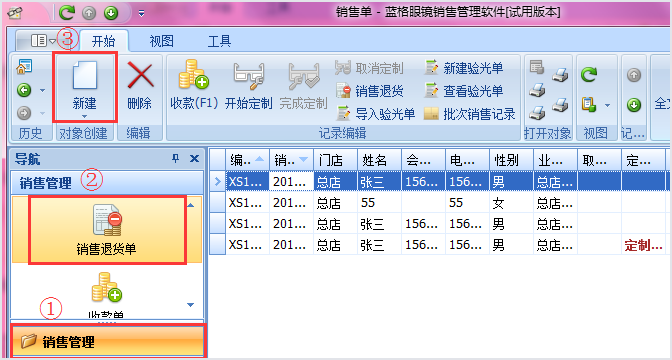 进入眼镜店管理软件后,在导航栏中,点击①【销售管理】,选择②【销售退货单】,按③【新建】即可建销售退货单,如下图所示