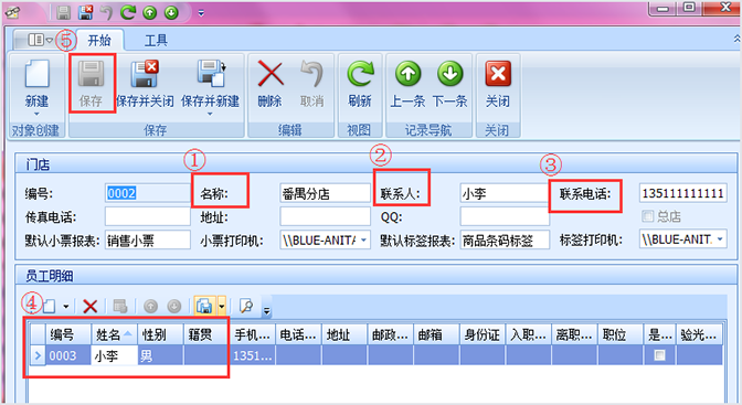新建后,把①名称,②联系人,③联系电话,④分店的员工明细,后按⑤保存就可以了。
